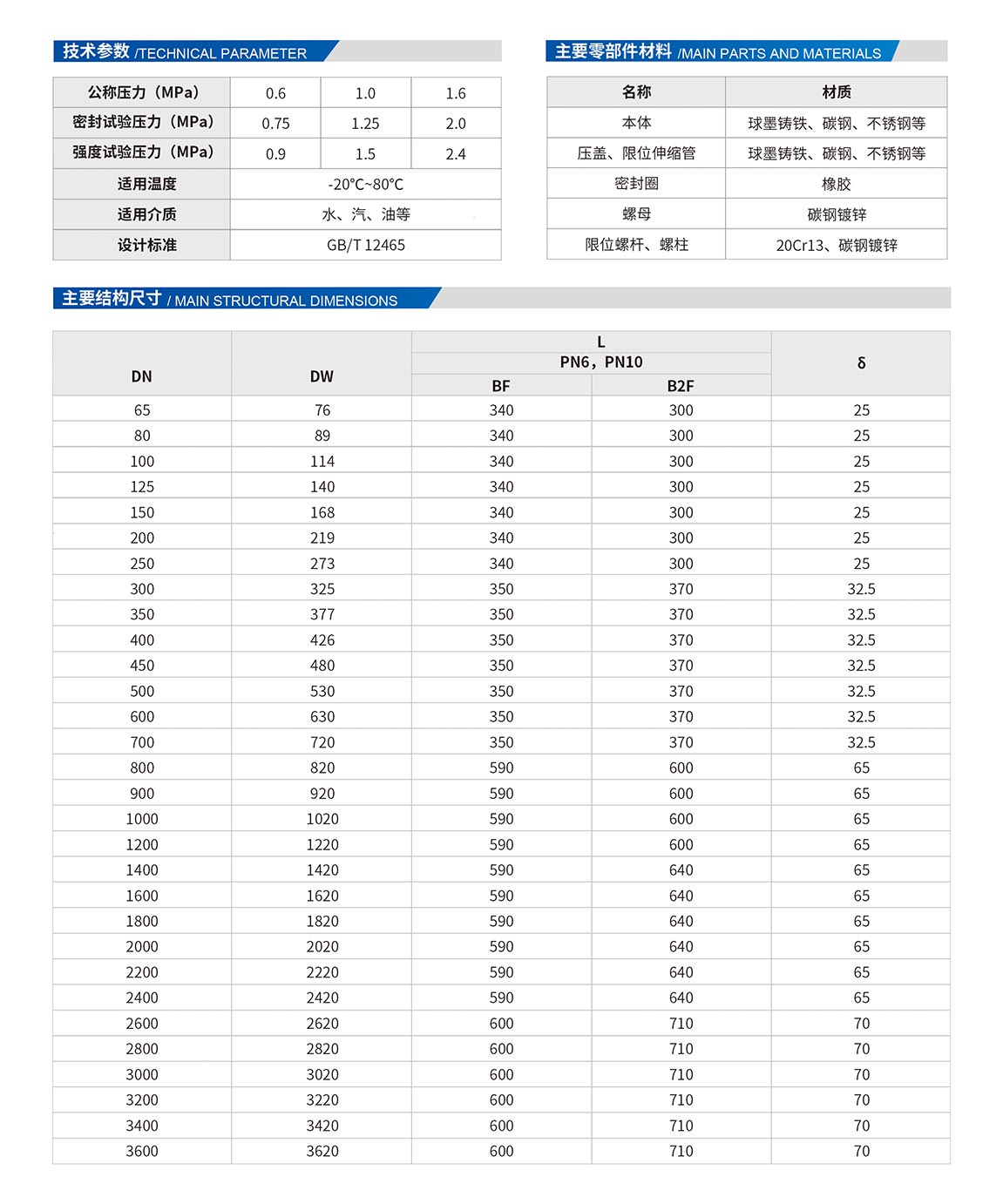 松套限位補(bǔ)償接頭可廣泛與蝶閥、閘閥、止回閥、截止閥等閥門及管道配套使用,可降低工程費(fèi)用能有效解決閥門裝卸困難。主要用于管道與閥門連接,可防止管道在外部作用力及熱脹冷縮引起的內(nèi)部作用力較大時(shí),拉脫伸縮接頭,造成不必要的管道泄漏事故。