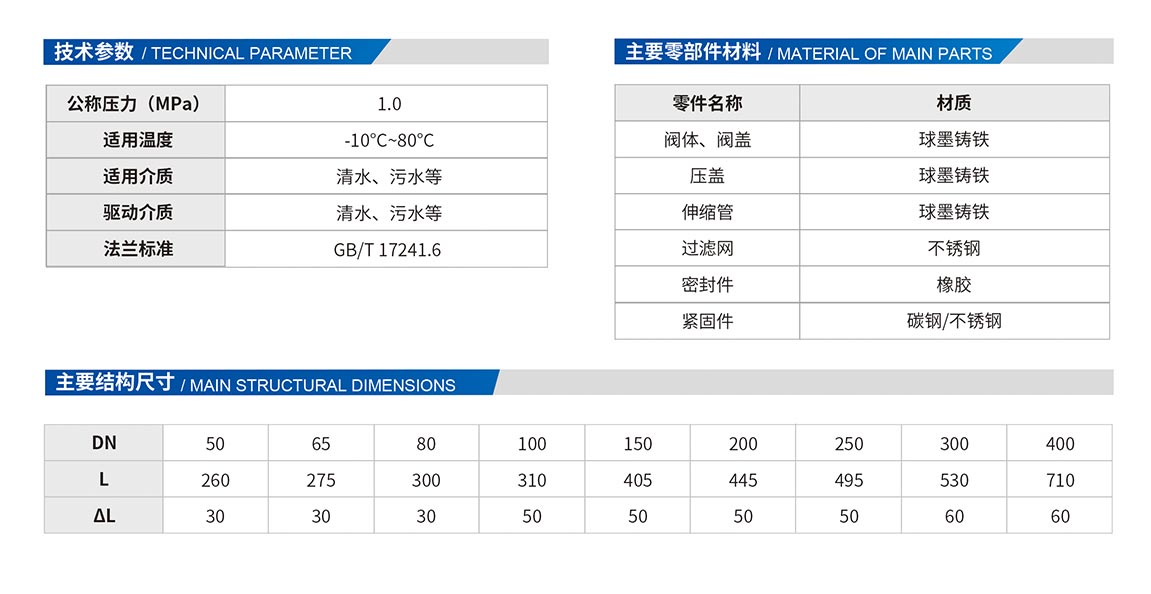 伸縮過(guò)濾器是過(guò)濾器和伸縮接頭的組合,它也是輸送介質(zhì)管道上不可缺少的一種裝置,通常安裝在減壓閥、泄壓閥、定水位閥或其它設(shè)備的進(jìn)口端。當(dāng)管道中的介質(zhì)進(jìn)入過(guò)濾器時(shí),介質(zhì)通過(guò)濾網(wǎng)進(jìn)入被連接的閥門(mén)中,而雜質(zhì)則留于過(guò)濾桶內(nèi),使各類(lèi)閥門(mén)不會(huì)由于機(jī)械雜物卡入密封圈而失靈。另加不銹鋼伸縮拉桿,補(bǔ)償管道尺寸,安裝靈活。